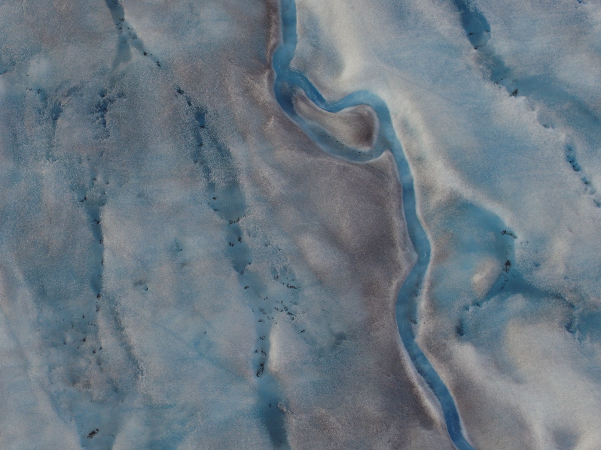 Es war eine unglaublich schwierige Etappe durch ein Eislabyrinth mit anderthalb Meter tiefen Abflussgräben, Rinnen, Buckeln, scharfen Eiskämmen, Eisnadeln, Abflusslöchern… und wir mit den riesigen Pulkas mittendrin. Chaotisch, surreal, hoffnungslos könnte man das nennen. Wir kämpften zu viert, zu dritt, oder zu zweit mit einer Pulka, um dann den Weg wieder zurück zu gehen und die nächste Pulka zu holen. Es hätte gut einen „Pulkatod“ bedeuten können. Doch dann kamen allmählich sogar relativ ebene Passagen ohne Wasserrinnen in Sicht und mit zunehmender Höhe lag älterer Schnee über dem Eis.