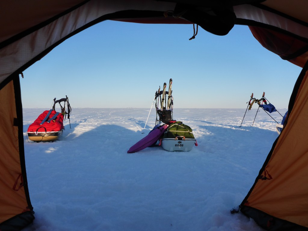 Nachdem uns der Regen hartnäckig begleitet hat und abends die Einschlafmusik auf dem Zeltdach war, ist das Wetter zuletzt besser geworden. Am Montag hatten wir noch einmal mit einigen Buckeln und Spalten zu kämpfen, aber konnten dann in flacherem Gelände endlich die Skier anschnallen und 10 km weit laufen. Daher hieß das Camp 05 auf 1111 m Höhe „Skicamp“.