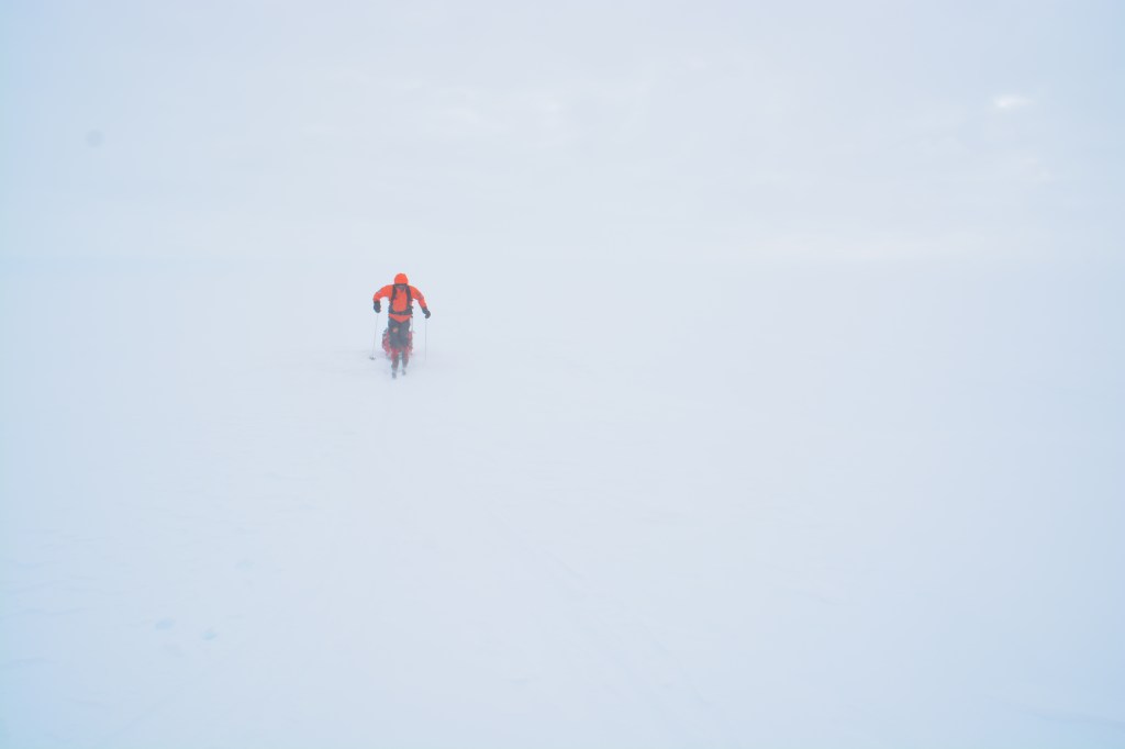 Der Dienstag markierte zwar den Beginn des Abstiegs in Richtung Westküste aber die Bedingungen wurden zusehends schlechter. Bei -15°C, straffem Gegenwind und schlechter Sicht haben wir uns durch den Tag gekämpft. Der Lageraufbau musste dann sogar bei Wind um die 50 km/h stattfinden. Das Camp 21 heißt daher „Stürmisches Camp“ und ist Franziska und Felix Korth sowie Georg Kupke gewidmet.