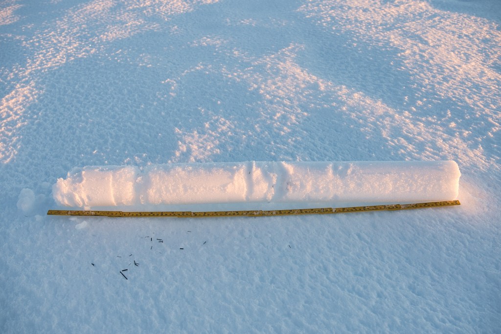 Heute haben wir die Schneedichte gemessen und das geht so: man gräbt ein schwarzes, 1m-langes Rohr einen Meter tief in den Schnee und holt es wieder raus. Dann wird gewogen. Masse durch Volumen. Im Vergleich zum letzten Jahr ein Meter mehr als man denkt. 🙂