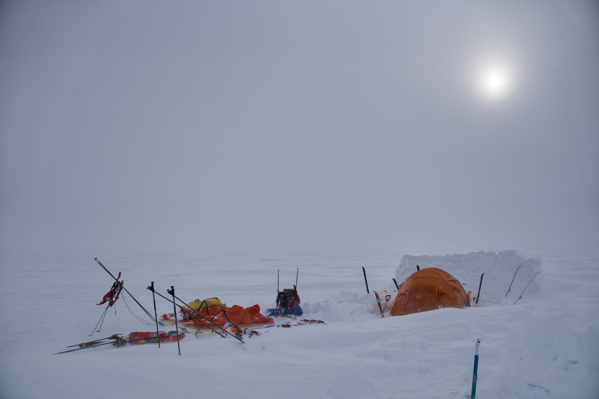 Komplettes White Out. Wir bewegen uns nur noch fühlend fort, oft wird uns schwindlig, man weiß nicht wo’s hoch bzw. runter geht.