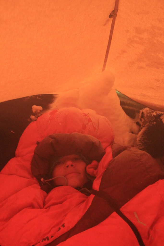 Rings um uns herum hat sich auf dem Zelt und den Pulkas Schnee angesammelt. Wir sind für starke Stürme, die in der kommenden Woche und auf der Westseite unserer Tour häufiger werde können, gut vorbereitet. Wir können eine Windmauer aus Schneeklötzen bauen oder uns eingraben. Sind gut in der Zeit.