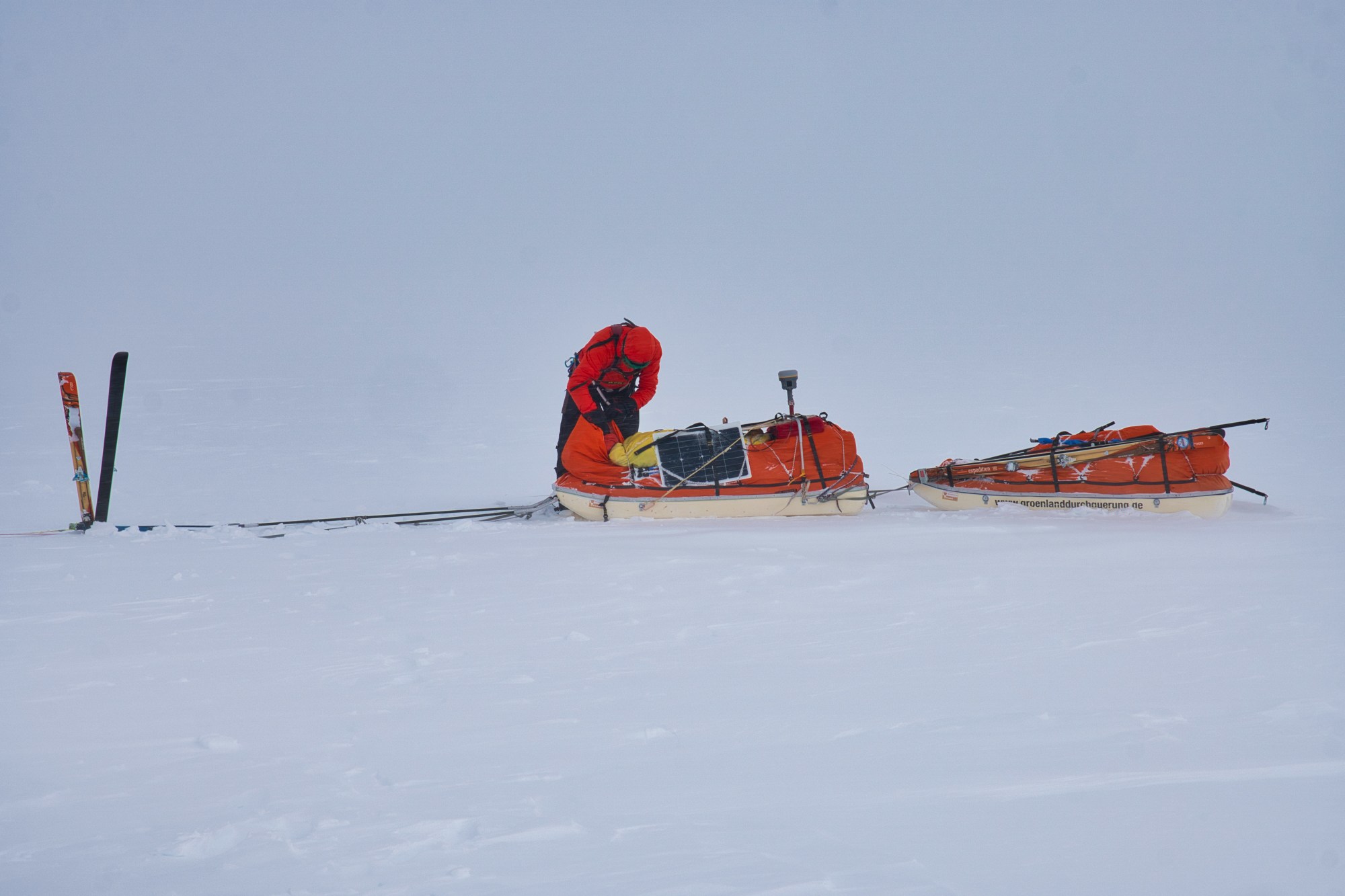 Nach dem Sturmtag im Zelt mussten wir heute erstmal die Schlitten ausgraben und das Zelt von Schnee befreien. Dann gings direkt vom Zelt aus mit den Kites los. Machen alle 20km Pausen um Messungen durchzuführen. Vormittags kommen wir mit 12-18km/h vorwärts, nachmittags mit ca. 20km/h. Es ist immer flach und geht leicht bergab.