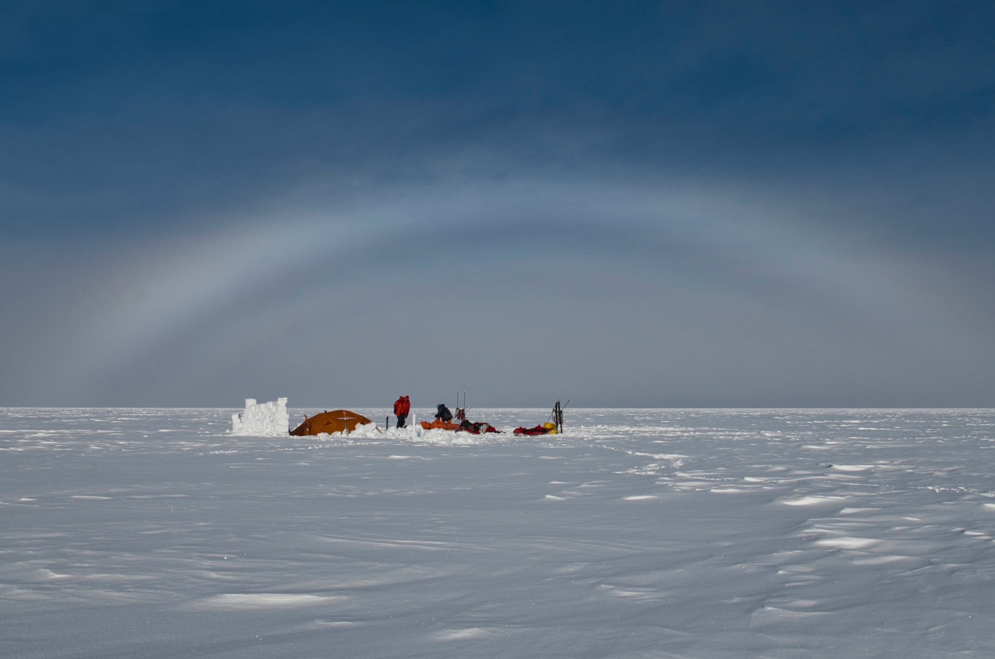 Heute haben wir den zweiten Tag mit Messungen bei den Stober-Punkten verbracht. In Begleitung von David Severin haben wir einige Fußabdrücke im Schnee hinterlassen. Wir schauen, dass wir soviel wie möglich essen, damit wir so wenig wie möglich tragen müssen, wenns dann über Festland ohne Schnee geht. Mussten die Platte für die Antenne reparieren, die wegen des welligen Bodens durch die Erschütterung kaputt gegangen war. Es schneit leicht mit White Out, manchmal kommt die Sonne durch. Ca. 0 Grad, ohne Wind. Es ist sehr warm.