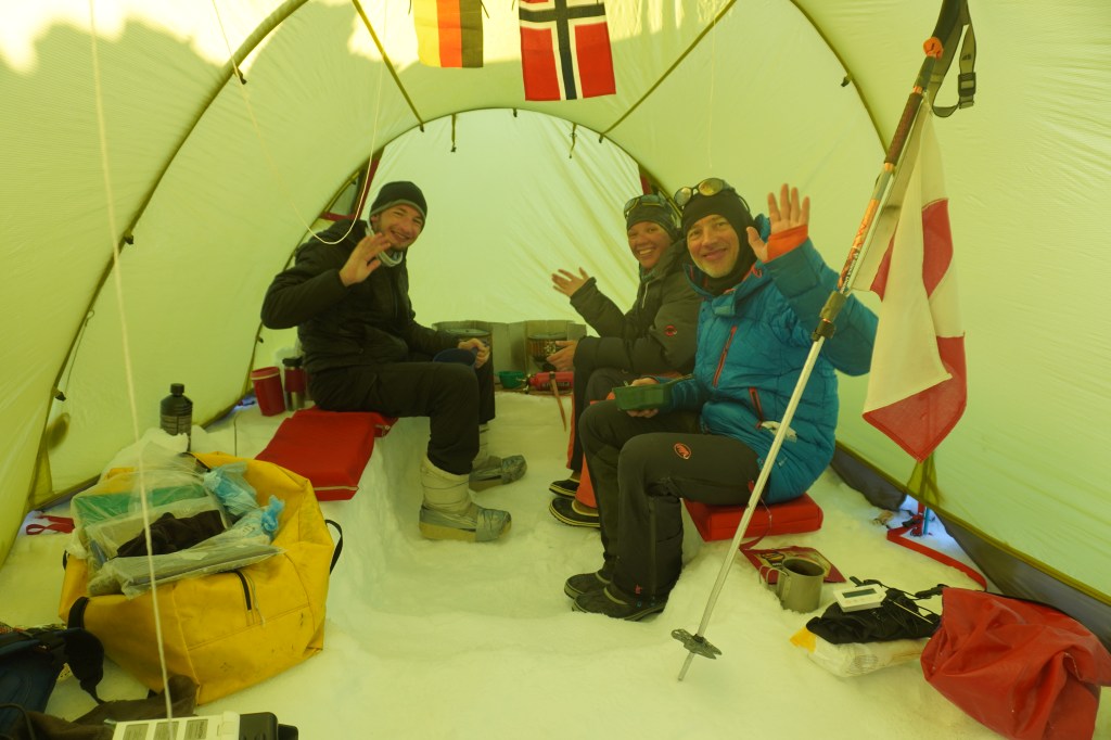 Camp 1: „Pavia’s Helicamp“, gewidmet unserem Crowdfunding-Helden des Tages: Ralf Heller! Der Helikopterflug gestern war spannend bis zum Schluss: Kurz vor dem Abflug war aufgrund von Kerosinmangel am Flughafen noch nicht klar, ob wir fliegen können. Doch nach einem Boxenstopp in Kulusuk setzte uns unser Pilot Pavia sicher auf dem Eis ab. Nach der Ankunft erfolgte der Aufbau unseres Lagers: