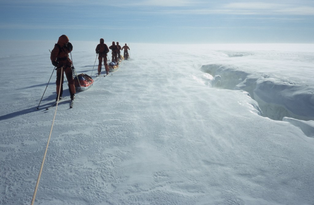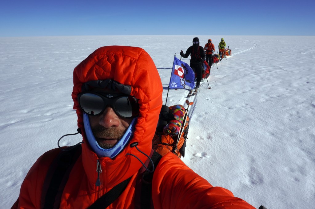 Heute war ein fantastischer Tag – Sonnenschein und perfekte Schneebedingungen! Wir hatten einen langsamen Start und mussten manchmal Ski und Pulkas justieren. Das Inlandeis begrüßte uns sogleich mit einem unglaublichen Tag! Wir kamen an Eisbärenstufen (ausschlaggebend für den Campnamen, grönländisch für Eisbär) und drei Gletscherspalten vorbei. Ansonsten funktioniert die Ausrüstung und die Aussicht auf das Schweizer Land ist unglaublich.