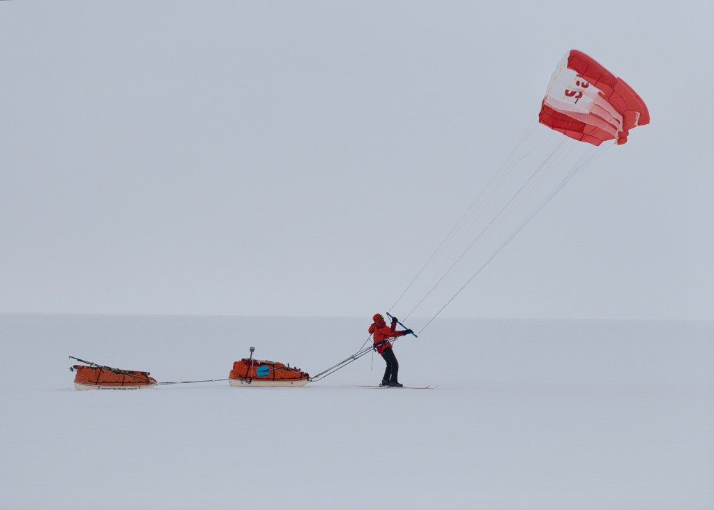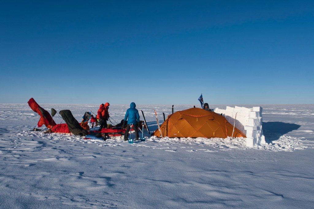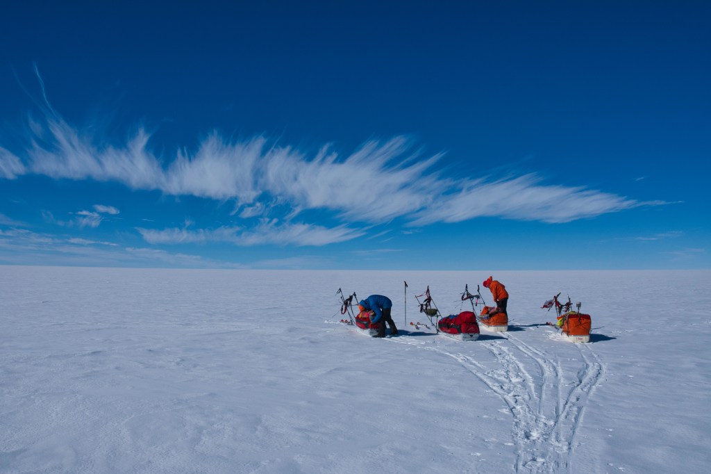 Gestern Abend hatten wir eine Taktikbesprechung. Die Bedingungen sind hart, aber wir wussten, dass wir mehr Fortschritte machen mussten als in den letzten Tagen. Also beschlossen wir, das Gewicht in unseren Pulkas neu zu verteilen, damit alle mehr oder weniger das gleiche Gewicht ziehen.