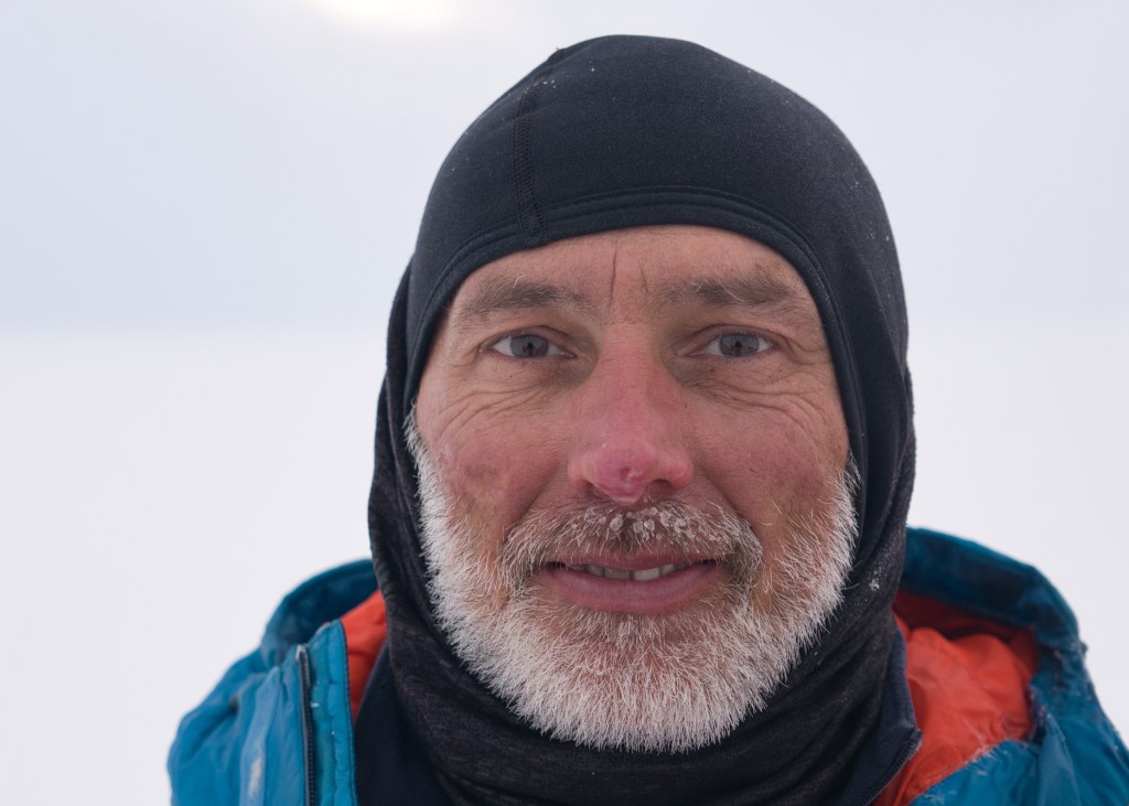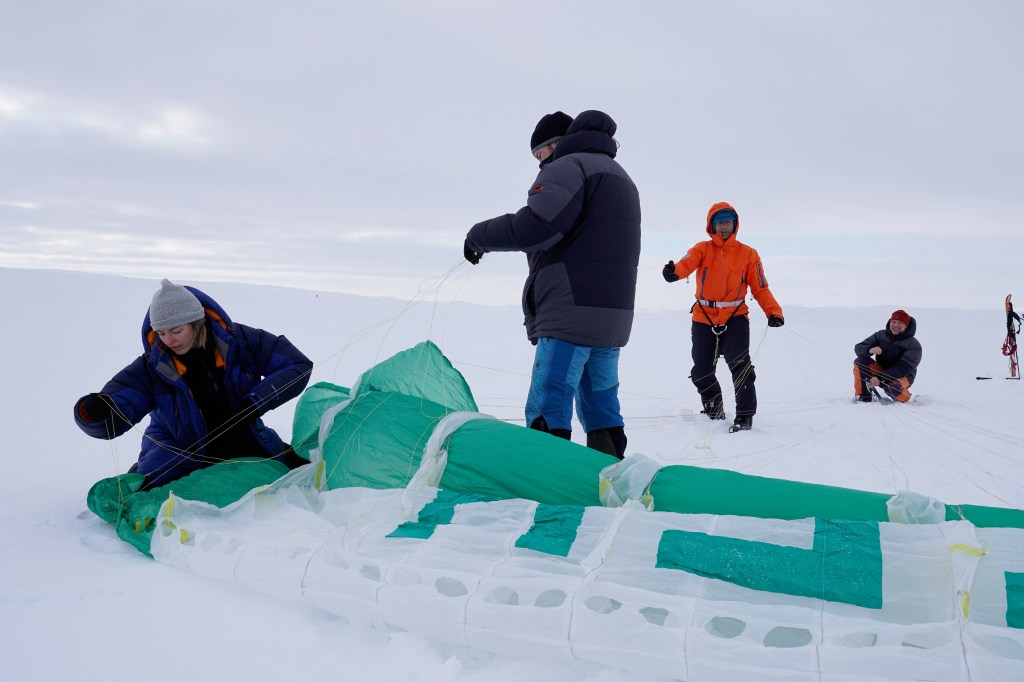 Heute hatten wir eine Mischung aus Kiten und Skifahren – wir sind 12,5 km Ski gefahren und sind 10 km gekitet – wobei das „Kiten“ eher ein Spaziergang mit unseren Kites war. Die Windgeschwindigkeit war ein bisschen zu gering für richtiges Kiten, also sind wir viel damit gelaufen. Das spart dennoch Kraft, als wenn man die Pulka aus eigener Kraft ziehen muss. Heute Morgen haben wir -15,9 Grad gemessen und es war eine der kältesten Nächte bisher!