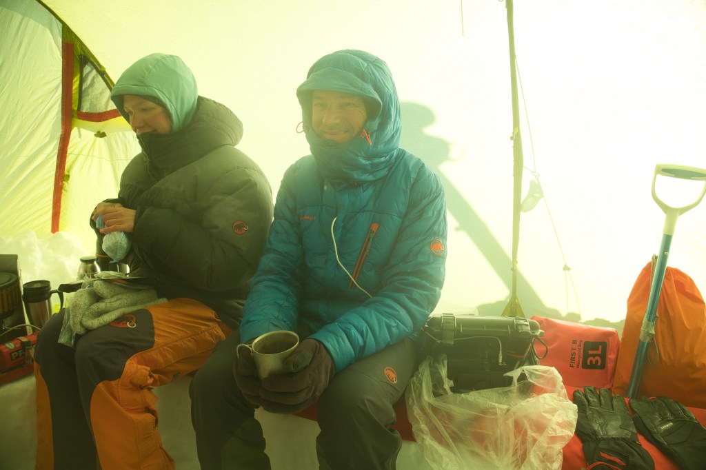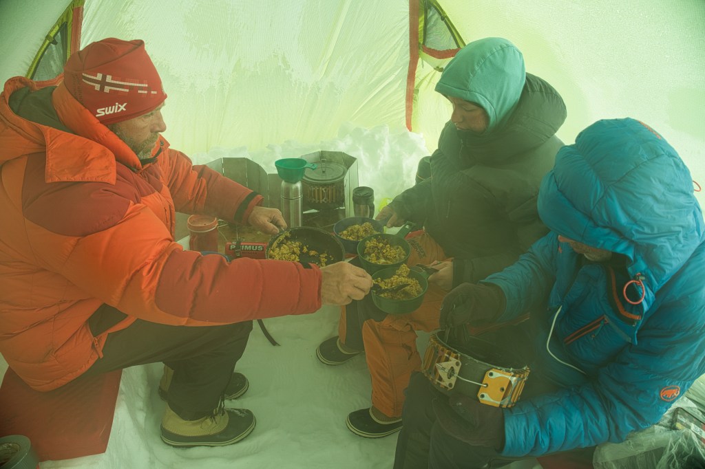 Jetzt sitzen wir im Küchenzelt, genießen unser Beef Stroganoff und hören zu, wie der Schnee auf das Zelt fällt.