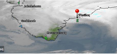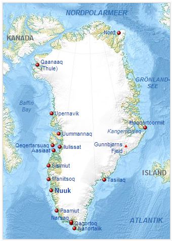 Aktuelle Wetterinformationen für Grönland sind durch „Klick“ auf die Wetterkarte abrufbar, allerdings nur für Orte an der Küste.